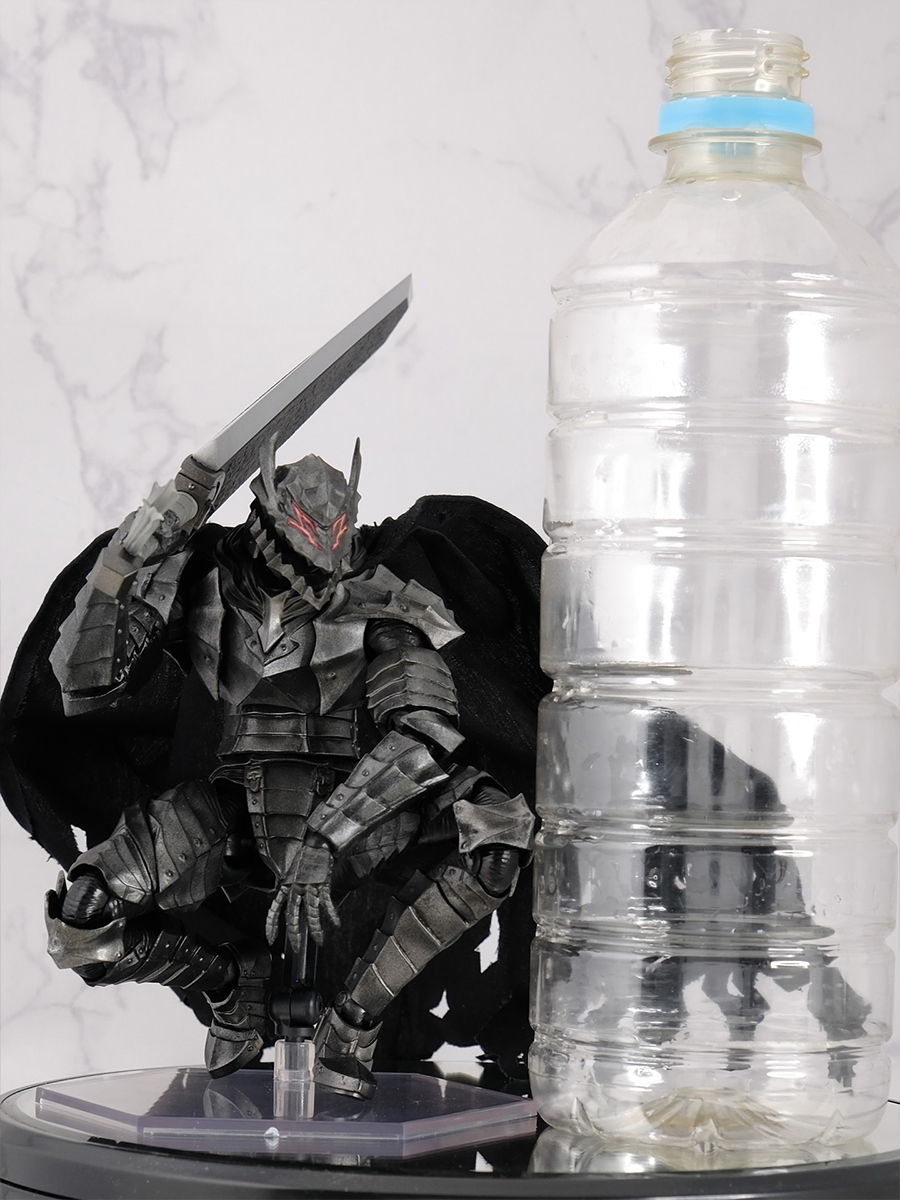 あと、剣の柄などを塗装し直し ています。メーカーのHPを確認すると大きさは全高約185mmと記載があり、しゃが んだ状態でもペットボトルと並べるとこの大きさです。