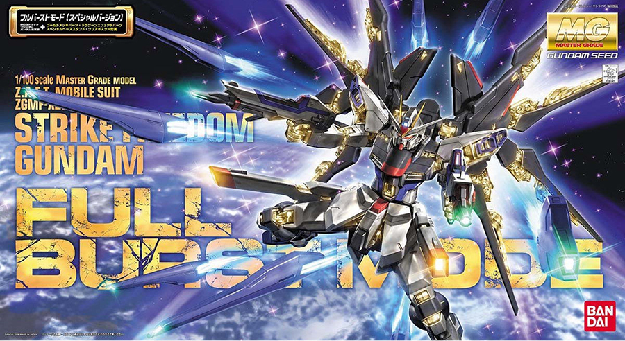 MGストライクフリーダムガンダムに豪華オプション満載のスペシャルバージョン出現! 設定通り機体の関節を黄金色のメッキパーツで再現 劇中のフルバーストシーンを再現可能なドラグーンエフェクトパーツ付属 スペシャルバージョンでしか手に入らないクリアーブルーのアクションベース付属。