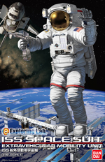 国際宇宙ステーションで活躍する最小の宇宙船、船外活動用宇宙服が登場。各関節の可動は、宇宙服開発時に要求された自由度をほぼ再現。無重力の環境で踏ん張るための足場、APFR(関節付きポータブル・フット・レストレイント)が付属。 ヘルメットは着脱可能。ヘルメット左右のヘッドライトは白色LEDで点灯可能。バイザーは開閉スライド式。スナップフィット方式で、接着剤を使わずに組み立て可能