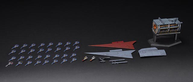 詳細設定を元に、艦載機を収納可能なターレットリング(格納庫)を精密に再現。 同スケールのコスモファルコンが32機付属し、ターレットリングに搭載可能。 付属の専用ディスプレイベースによりターレットリング単独で展示が可能。 ターレットリングは1/500宇宙戦艦ヤマト2199に搭載可能。第一格納庫を再現できる。コスモゼロのエレベーター及び連結発射用カタパルトが付属。1/500宇宙戦艦ヤマト2199付属のコスモゼロも展示が可能。 安定翼が付属。1/500宇宙戦艦ヤマト2199の安定翼を再現できる