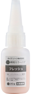 高粘度の色付き瞬間接着剤系パテです。混色の難しいフィギュアなどに使うフレッシュの登場です。このフレッシュをベースにして他のカラーパテを混色することが可能です。RC.ベルグ社の協力でベルグフレッシュに近い色味にしています。遅硬化タイプなのでじっくり調色してから使用できます。硬化後は切削性が良く、デザインナイフや紙やすりで仕上げることができます。合わせ目消しや気泡の穴埋めに最適です。硬化までに時間がかかるので、早く作業したい場合は硬化促進剤(スプレーなど)をご使用ください。容器をリニューアルしたことで使い勝手、保存性が向上しています。