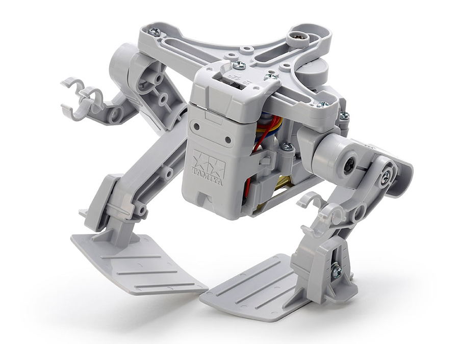 重心移動の動きだけを利用してトコトコ歩く、本格的な2足歩行ロボットの工作セットです。ロボットはモーターやギヤボックス、電池ボックスなどをひとつにまとめた「重心移動ユニット」と大きな2本の脚で構成。上手に歩く秘密は、重心移動ユニットの動きと脚の構造にあります。モーターの回転運動をクランクを使ってスライダーに伝え、往復運動に変えることでユニットが左右にスライド。ユニットが右側に移動すると体が右側に傾き、持ち上がった左足が前にふられ、左右で交互にこの動きを繰り返して歩きます。また、ギヤボックスの向きや、足の外側のリミッターを調整すれば、左まわり・右まわりに旋回可能。さらにT字形のガイドロッドを取り付けると、壁や障害物をよけて進みます。はめ込みやビス止めのやさしい組み立てで完成する手軽さもポイントです。