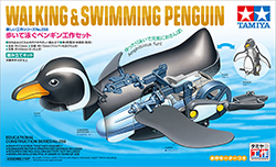 地上をペタペタ歩き、水の上をゆったり泳ぐ水族館の人気者、ペンギンの工作セットです。体にセットしたミニ水中モーターのパワーをギヤボックスでクランクホイールに伝達。リンク機構を使って回転運動を往復運動に変え、フリッパー(翼)を羽ばたかせながら足を交互に動かして元気におさんぽ。水の上では頭をあげて、フリッパーの力だけで泳ぎます。しかも、お腹のラダーやフリッパーの付け根のリミッターを調整すれば、地上と水上どちらでも左まわり・右まわりに旋回OK。パーツのほとんどがビス止めとはめ込みだけで完成する手軽な組み立てもポイントです。