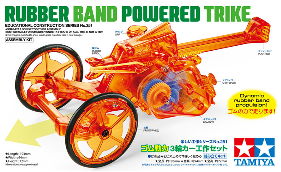 のばした輪ゴムが戻る力で走る3輪カーの工作セットです。プッシュロッドを押して輪ゴムをのばし、ゴムが戻るときだけタイヤが回るワンウェイクラッチを使っているのもポイント。大きな前輪に角度を付ければ、左右に旋回走行させることができ、シフトレバーで、力のあるパワータイプと長く走れるスタミナタイプ、2種類のギヤ比が選べます。必要な部品はすべてセットされ、はめ込みとビス止めで手軽に作れます。