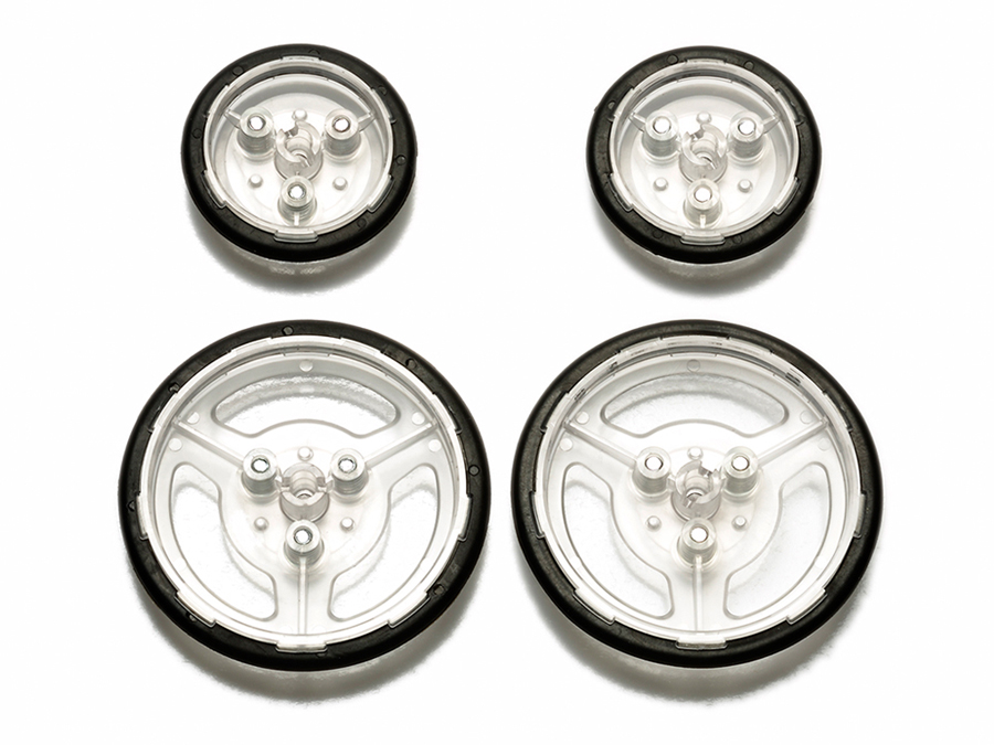 幅が狭いので大型の車体をコンパクトに製作できるタイヤセットです。剛性が高いソリッドタイヤですから左右のタイヤを逆回転させての超信地旋回も軽快。大型の工作やパワーが必要な工作に適しています。また2種類のホイールハブが付いて、楽しい工作シリーズはもちろんテクニクラフトシリーズのギヤボックスにも取り付けられます