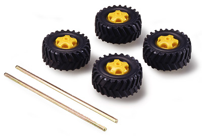 各種の工作に幅広く使えるオフロード用タイヤとホイールを各2個ずつセットしました。3速クランクギヤボックスなどと組み合わせて、パワフルでダイナミックな走りの工作を楽しんでいただけます。3×100mm六角シャフト付き。取り付けネジがいらず、シャフトに押し込むだけで装着できるのも特長です