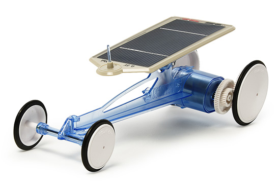 ソーラーバッテリーを使って動くソーラーカーの組み立てキットです。フレームはさわやかなクリヤーブルー。前輪はステアリングでき、ギヤ比も3種類が選べます。搭載される0.5V-1500mA仕様のソーラーバッテリーは、ボールマウントにより角度の調整が可能