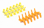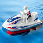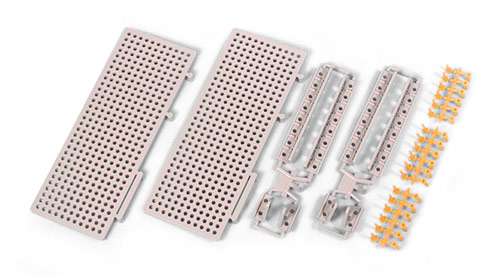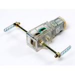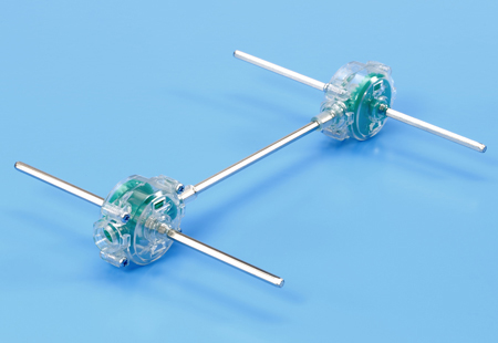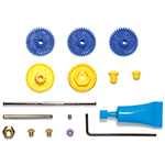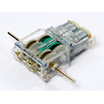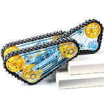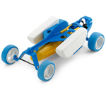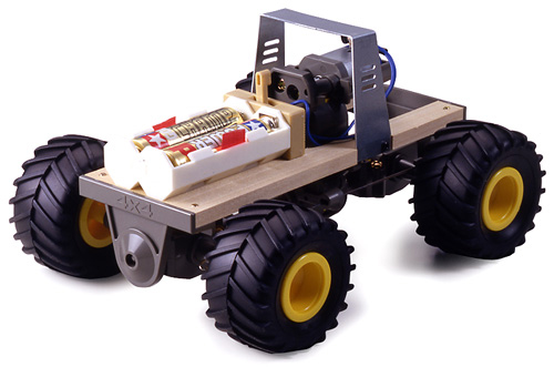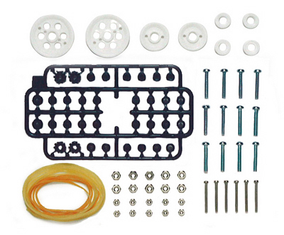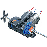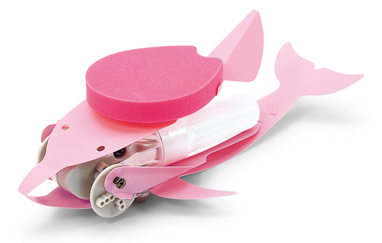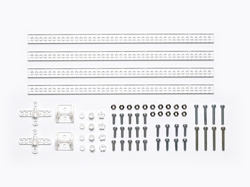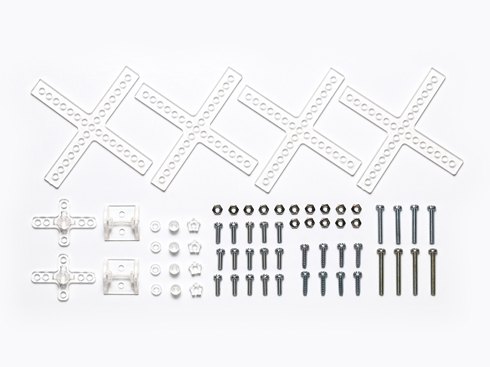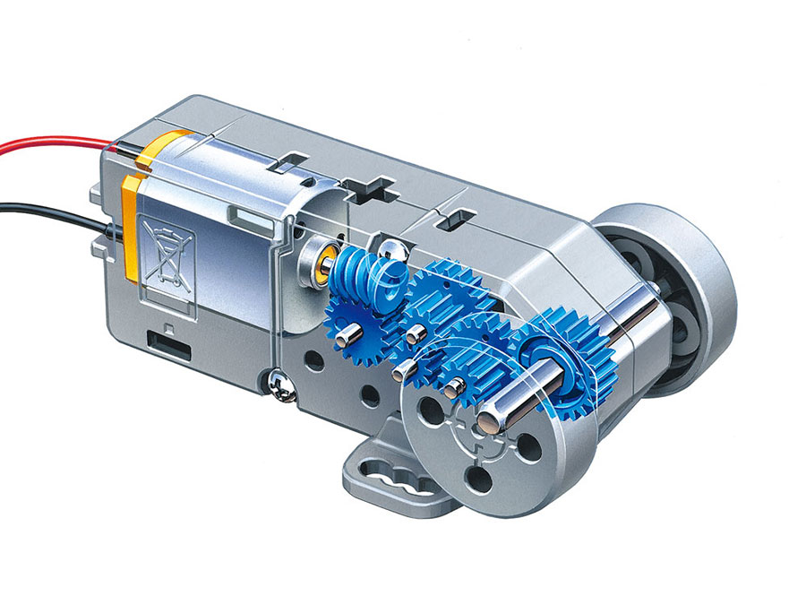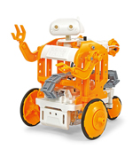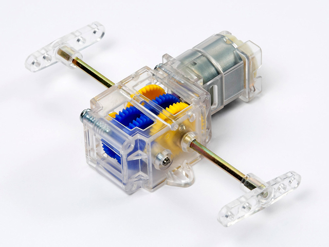 小さな前輪2本と大きな後輪2本を備えて、壁などの障害物にあたると自動的に右に旋回して進む工作です。動きの秘密は前輪を動かすクラウンギヤボックス。ふだんは前輪に動力を伝えて前に進みますが、壁などにあたって前輪が止まると、ギヤボックス自体が前輪といっしょに回転。車体が自動的に右に方向を変えて、障害物がなくなると再び前進します。障害物に当たったときに方向転換しやすい、半円形のバンパーが特徴的なユーモラスなボディや前後のホイールは、ライトバイオレットカラーのABS樹脂製。ボディ上部のアンテナをイメージしたパーツは、走行に合わせて回転するので、コミカルなムードもたっぷりです。また、アンテナパーツの代わりにメッセージカードなどをセットするのもおすすめ。小動物のようにかわいらしく動きながら、頭の上でくるくるとカードを回す様子は、思わず笑顔になることうけあい。サプライズの盛り上げにもうってつけです。必要な部品は全てセットされ、ビス止めとはめ込みで手軽に作れます。マーキング用ステッカー付き。