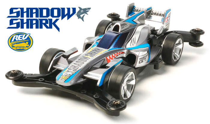 高性能な走りでレースも楽しい四輪駆動レーサーのプラスチックモデル組み立てキットです。ボディからシャーシまで空力を追求して仕上げられたミニ四駆REVシリーズの第4弾がシャドウシャークです。大海原を泳ぐサメの形と、モータースポーツの最高峰と呼ばれるF1マシンのフォルムを合体。細いハイノーズと、コクピット後部のシャークフィン(背びれ)が特徴です