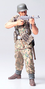 MG42機関銃用の三脚架を背負って行軍する第二次大戦中のドイツ国防軍兵士を、実感豊かな表現が魅力の1/16スケールで再現したプラスチックモデル組み立てキットです。人形の頭部はヘルメット着用と無帽の2種類から選んで組み立て可能。折りたたんだ三脚架は10数点のパーツで立体感たっぷり。前期型のワルサーホルスターなど装備品もシャープな仕上がりです。徽章類のスライドマーク、地面を模した展示ベースもセット。発売中のドイツ国防軍歩兵(行軍スタイル)と組み合わせ、行軍中の機関銃チームを再現できます