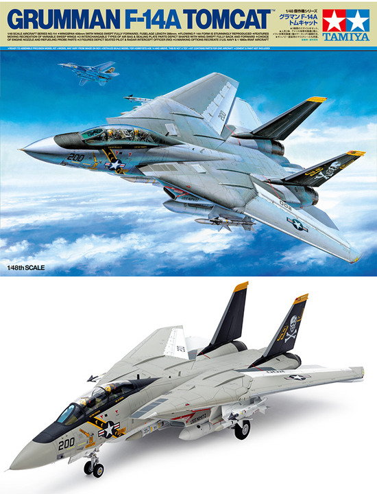 F-14の初期生産型、F-14Aのプラスチックモデル組み立てキットです。1/48スケール、全長398mm、全幅408mm(主翼前進時)。 綿密な実機取材に基づいて、流麗で量感あふれるスタイルを忠実に再現。