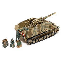 ドイツ軍の重自走榴弾砲 フンメル後期型の1/35スケール、プラスチックモデル組み立てキットです。★全長190mm、全幅84mm。Ⅲ号/Ⅳ号系自走砲専用車台に大口径15cm重榴弾砲を搭載した迫力ある姿を再現。★主砲は複雑な構造を合理的なパーツ分割でモデル化。★照準器は極小ビスを使用し、リンクにより砲の上下と連動。★戦闘室の装甲板は薄さを表現して高いスケール感を演出。★左右の操縦室が一体化した後期型の車体形状も注目。★後期型履帯は直線部分を一体とした連結組み立て式を採用。上部のたるみも自然な仕上がり。★射撃準備中の兵士の全身像3体、砲弾や装薬カートリッジもセット。★デカールは東部戦線と北西ヨーロッパ戦線の2種類を用意。