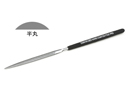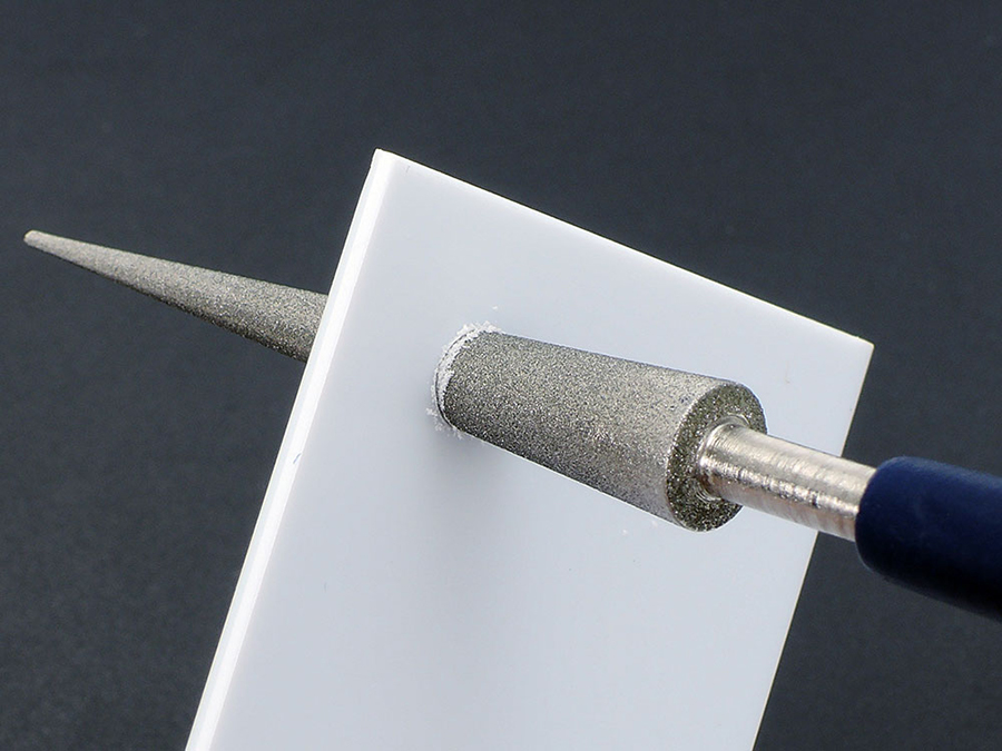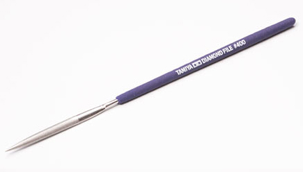 穴の開いたモールドの整形に便利な、円すい形状のヤスリです。パイプ状のパーツの縁を薄く削ったり、ミニ四駆のカーボンプレートなどの曲面の加工にも便利。切削性に優れた粒度#200のダイヤモンドヤスリにより、アルミや真ちゅうなどの軟金属も加工できます。ダークブルーカラーグリップにはシボ加工が施され、タミヤのロゴをホワイトでプリントしました。保護用のビニールカバーつき。