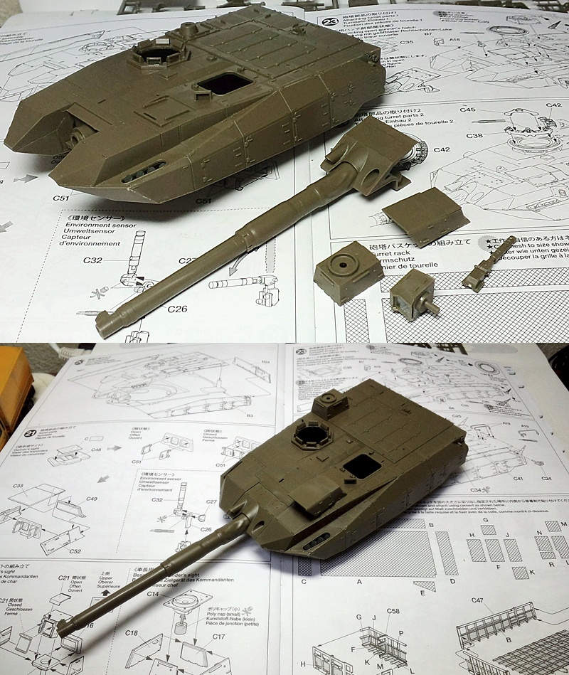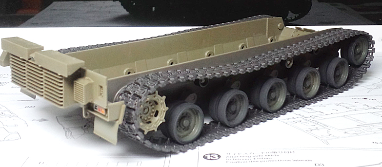 まずは履帯(キャタピラ)を覆うスカート。マスキングしないでよさそうなのでこの部分から。ちなみに実車のスカートはゴム製で、側方からの赤外線探知をしにくくする効果を狙っています。いわばステルスですね。