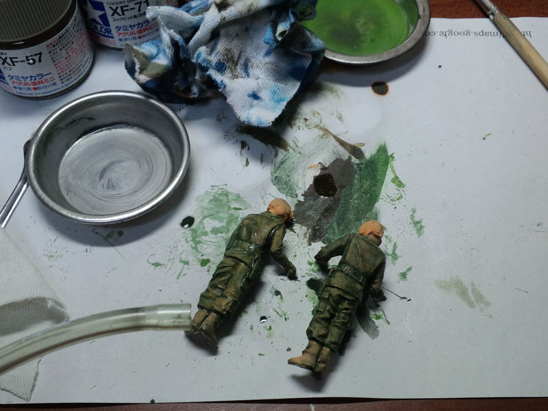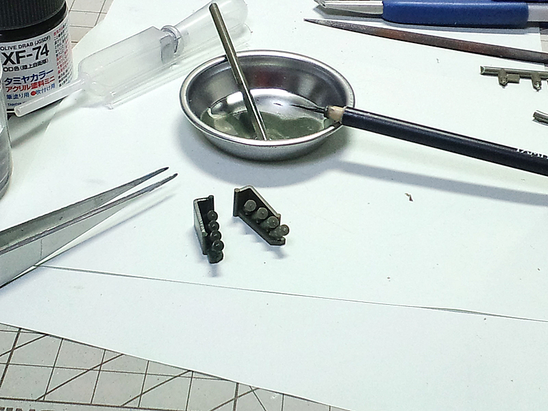 塗料皿に4色(フラットグリーン、バフ、レッドブラウン、ジャーマングレイ)同時に用意して、エアブラシ用のエアで吹いて乾かしながら筆塗りしたところ、手際がよかったと思います