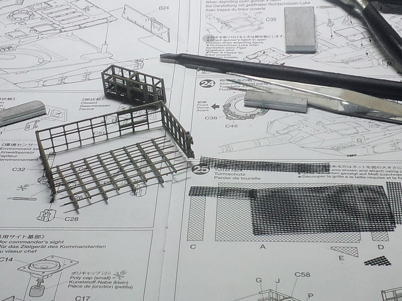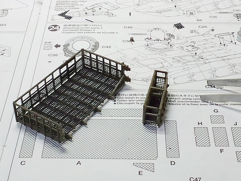 砲塔後部にはバスケットが備えられています。キットでは、このバスケットに貼るメッシュが入っていますので、切り出して貼り付けます。