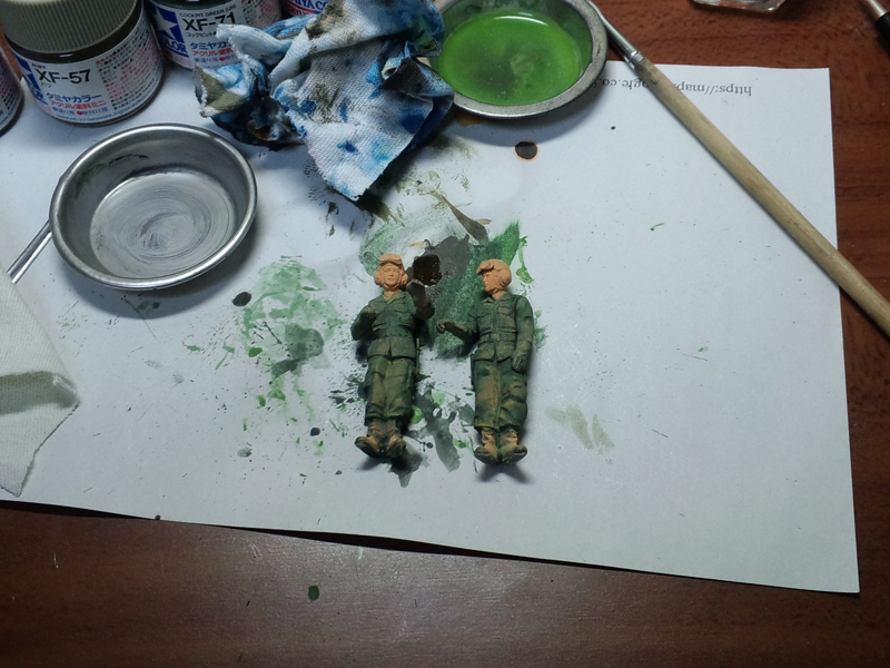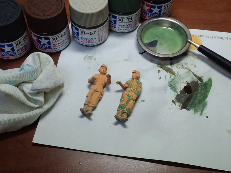 迷彩塗装は全体のバランスを見ながら、筆が残す跡も生かしながら。服のしわなど、濃淡をつけるとよい仕上がりです