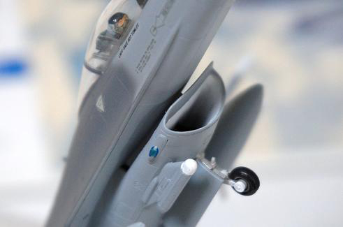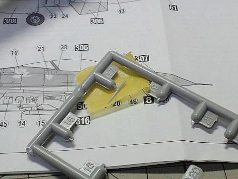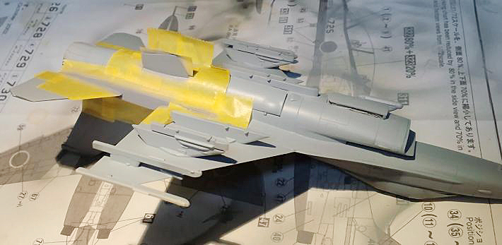次にこの格納場所のふたにあたる部品を、マスキングテープなどを使って仮止めします。つまり飛行状態を仮組します。