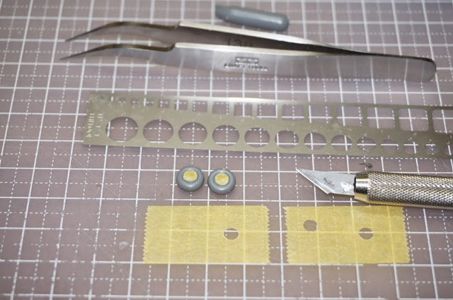 タイヤです。丸くくりぬいたマスキングテープを使い、つや消し黒を吹き付けます。