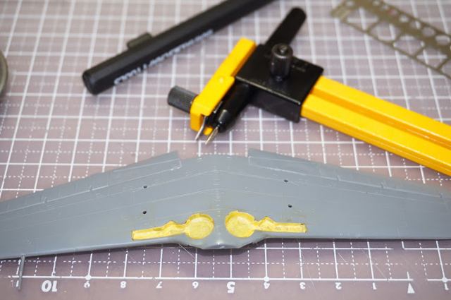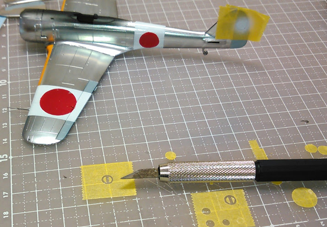 主脚の格納場所は、カーキ色に塗ったあと、マスキング。コンパスカッターが活躍します。