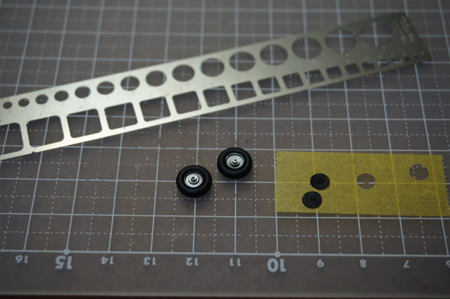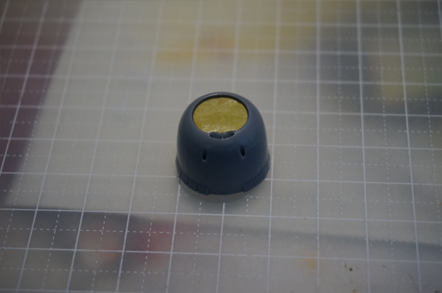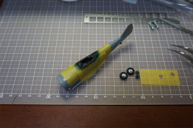 車輪の格納庫をシルバー、クリア青緑で塗り、味方識別の黄色を塗ってからマスキングして