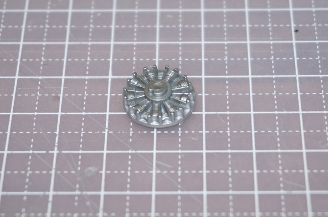 エンジンの塗装はシルバー、このあと薄めたエナメル系の黒の順に筆塗りし立体感を表現します