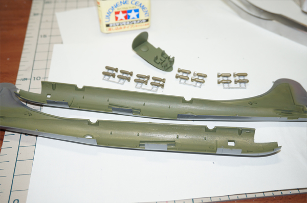 爆弾と取り付けラック。組立前に塗装したところ。ランナーからの取り外しあとはあとから筆塗り