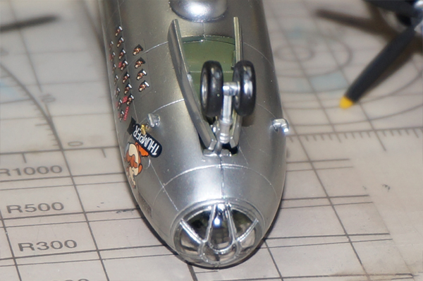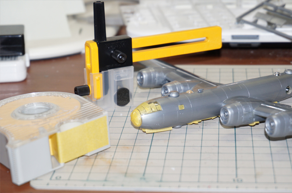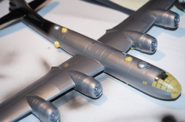 機体と窓枠の色の調子を合わせるため、細かな窓の一枚一枚にマスキングテープを貼り付けるのには苦労しました。もっとも苦労の甲斐あってよく出来たので、不気味な機首周りの窓が完成し、満足です。