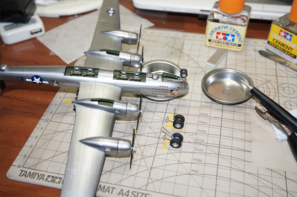 車輪の取り付け。この時になってから、機首の重りが足りなかったこと