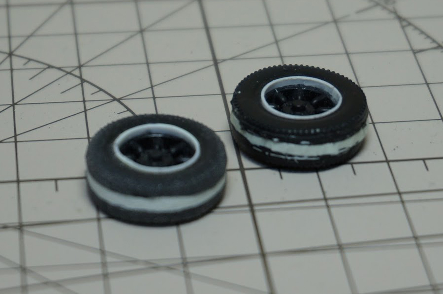 箱絵、実車とも似つかない全くサイズ違いの部品が入ってます。購入後、製作途中で途方に暮れていました。何週間も過ぎたころ、タイヤを縦に半分に切り、真ん中をパテで埋めるという方法をネットに載せている方がいらっしゃり、私も真似してみました。