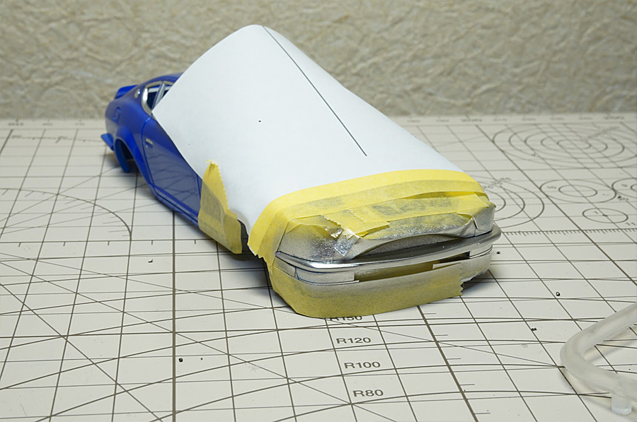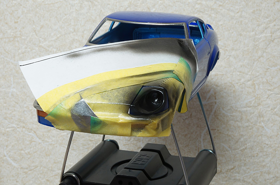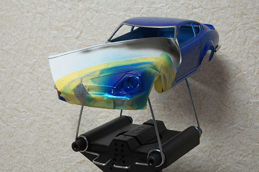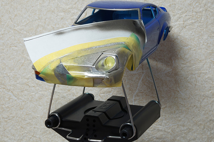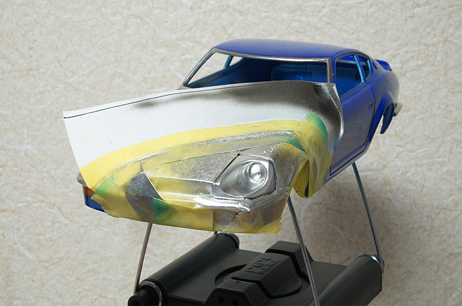 リューターでヘッドライト部分に穴をあけまして、エポキシパテでリフレクター部品を作り、メッキシルバーネクストで塗装しました。