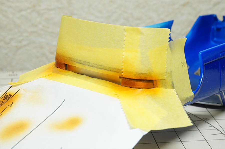 部品は何もないので、ウィンカーのかたちに銀色の下地塗装、クリアオレンジで上塗りして表現しました。