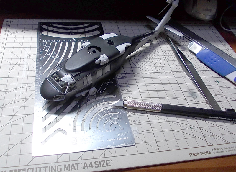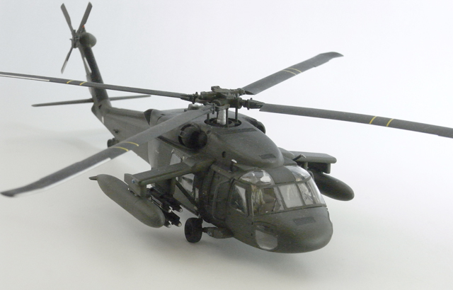 UH60は派生形や改修型が豊富です。つや消し黒の改修型があるので、隙間の埋め戻し作業の完成をチェックすることを兼ねて、黒く塗って、この改修型のイメージを再現してみました。