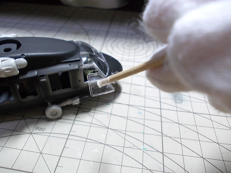 窓の部品の内側には、指紋や汚れを付けないように注意しました。部品が小さく、貼りつけ作業がちょっと難しいです。