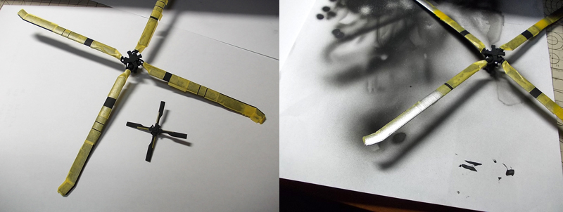 ブレード(回転翼)には黄色の細いラインと銀色の縁取りがあるので、黒色塗装のあと、マスキングして銀色、更にそのあと黄色を吹き付けています。しかし、細いラインの幅を揃えて、周りをマスキングは非効率でした。前回真っ黒に塗ったテールローターブレードも、今度はオリ-ブドラブ(OD色)に塗ります。こちらはOD色に黒色と銀色の縁取りですので、まず、縁どりの黒色部分にマスキングをして、銀色を塗り、その次に銀色の縁取り部分にマスキングして全体のOD色を吹きつけました