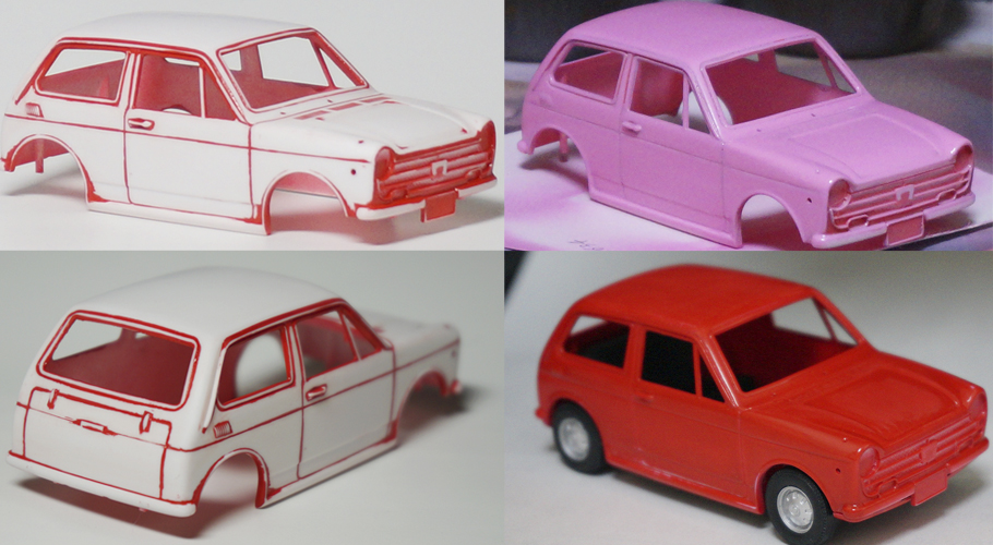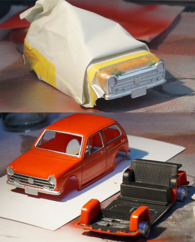 下地にピンクを吹きつけました。今度は塗料とうすめ液をスプーンで量って調整しました。失敗した赤い塗料が隙間に残っていて仕上がりが今一つなので、もう一度これをきれいに取り除いてから、モンザレッドを吹き付けました。